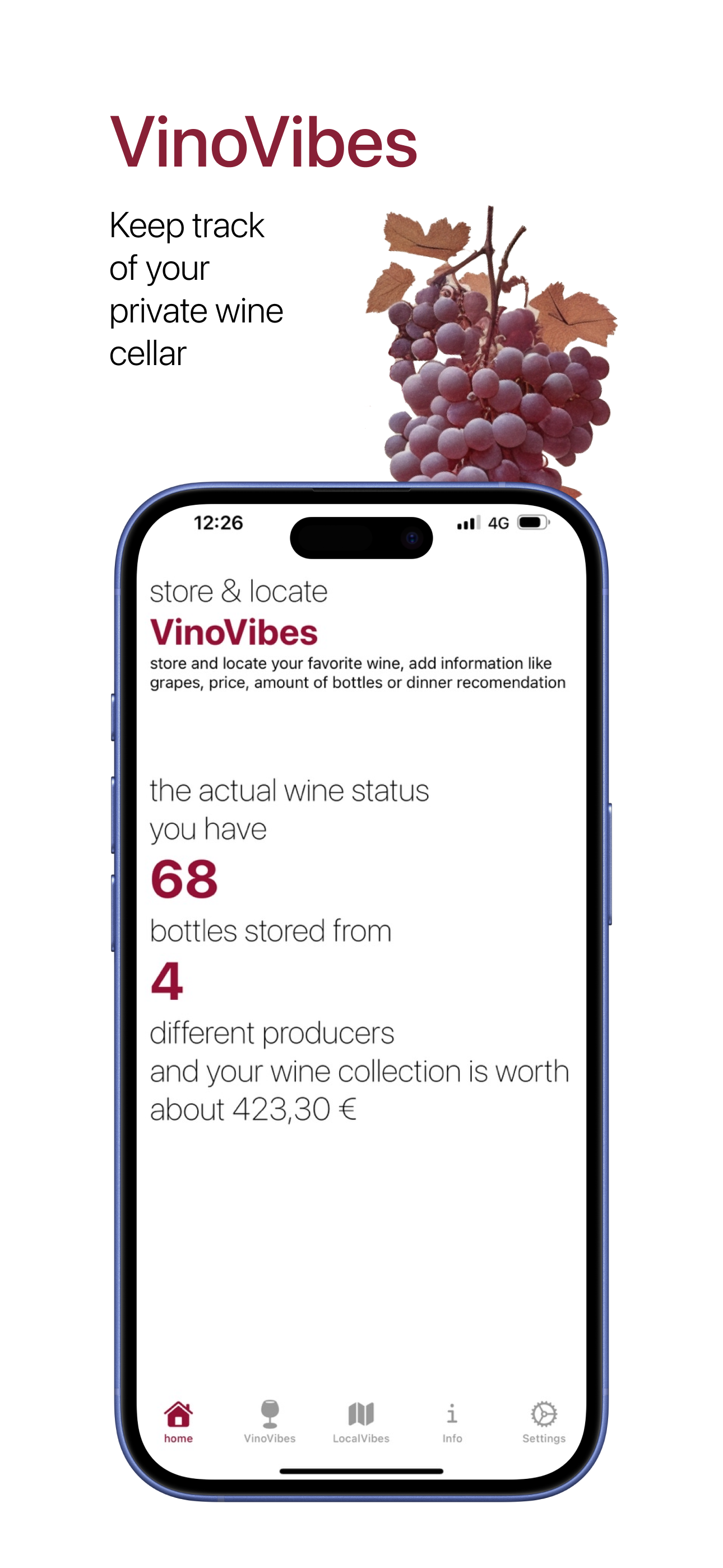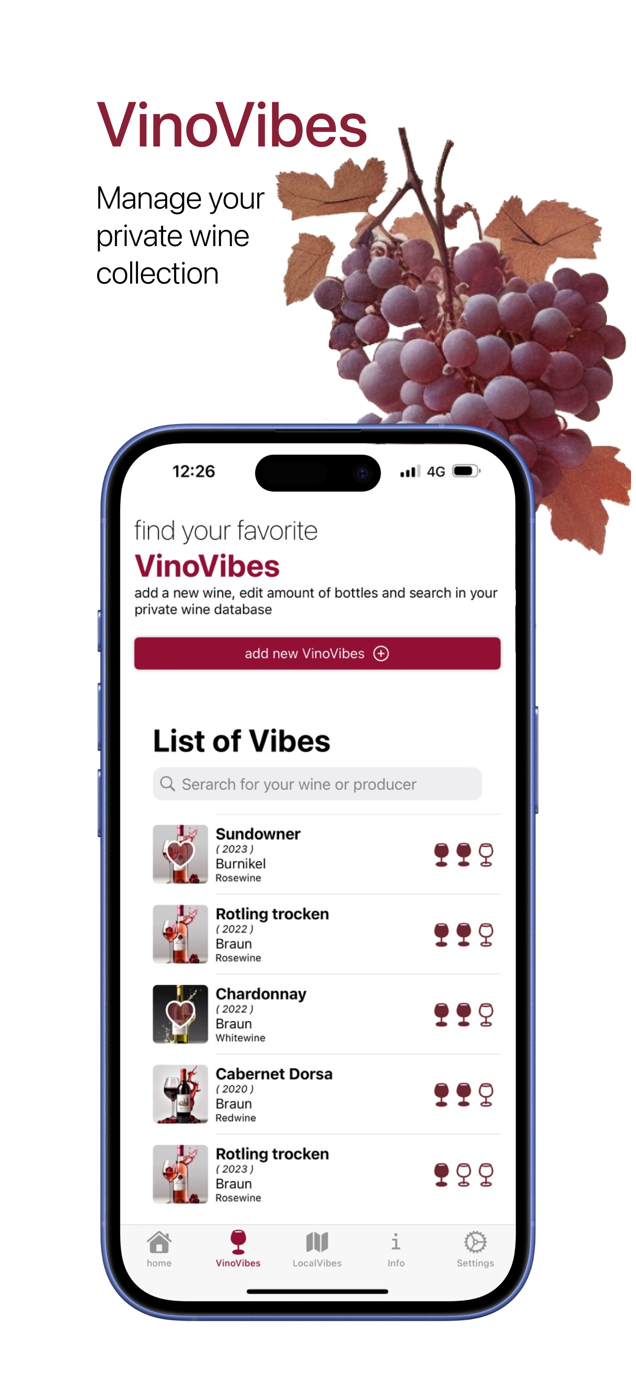 Take your wine experience to the next level with VinoVibes! Manage your private wine collection, discover wine bars nearby, and enjoy a unique Vino Vibe experience – all in one app.