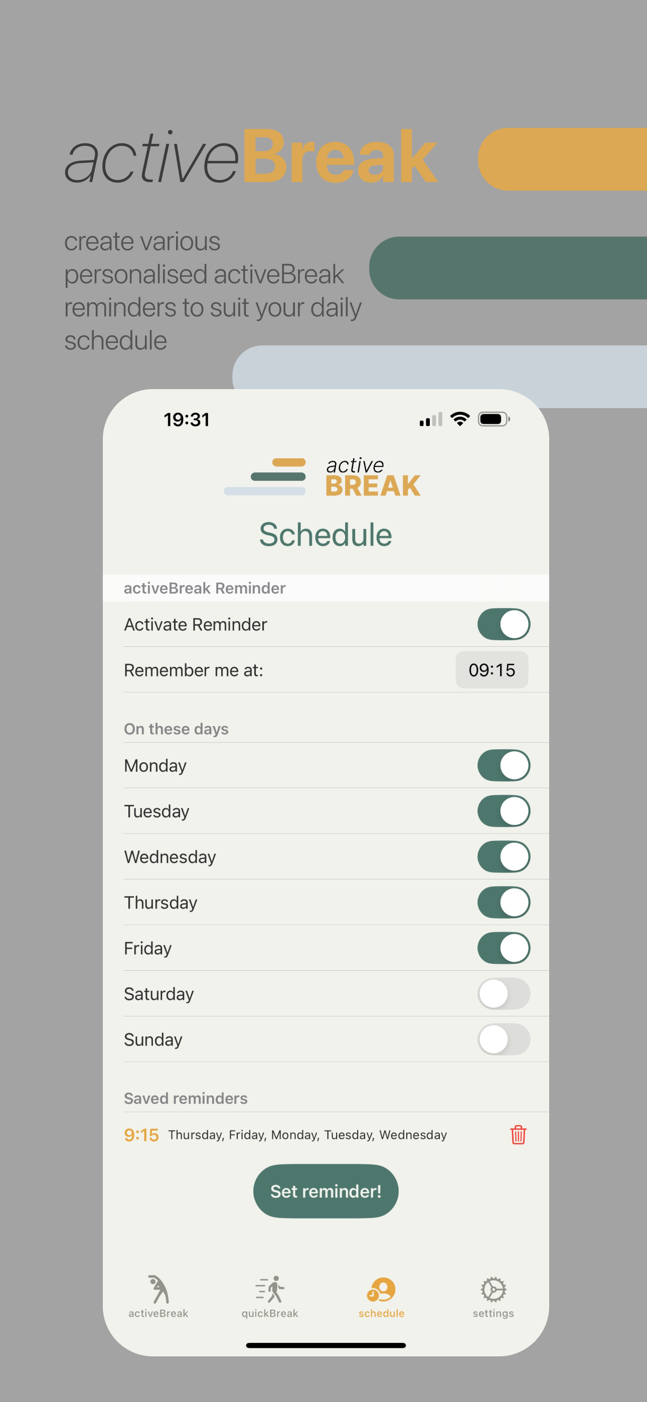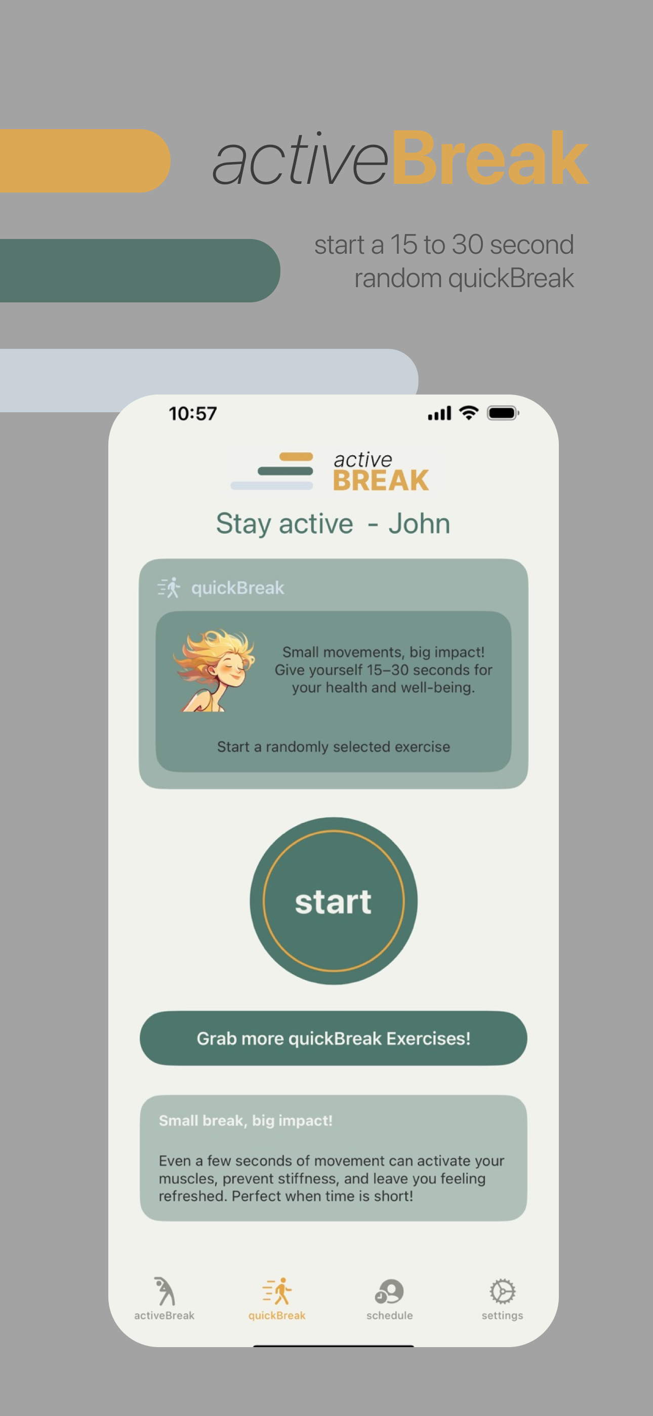 activeBreak helps users stay energized, reduce tension, and improve focus. Take a break that truly works – download activeBreak now!